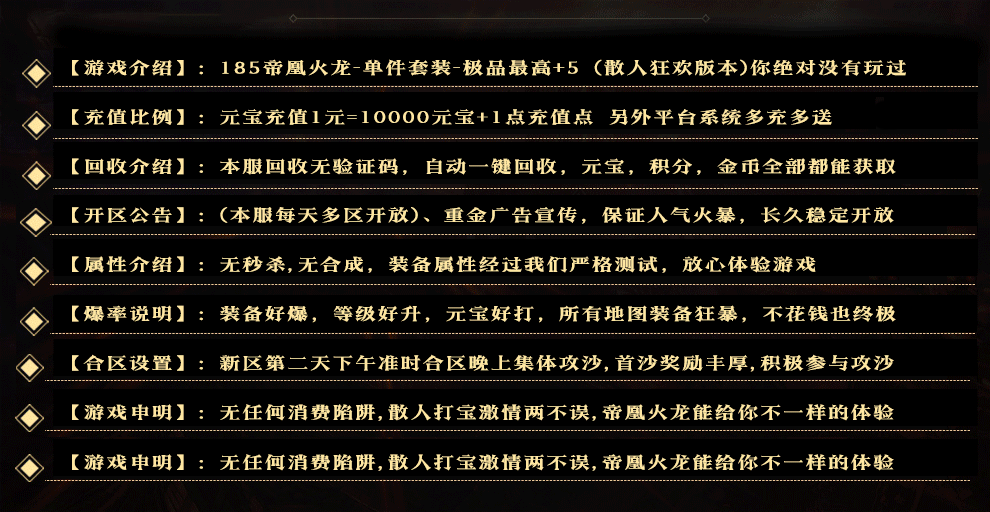 本游戏由 《帝凰火龙》 独家运营 All rights reserved. 版权所有 致力打造一个全民激情的好传奇!